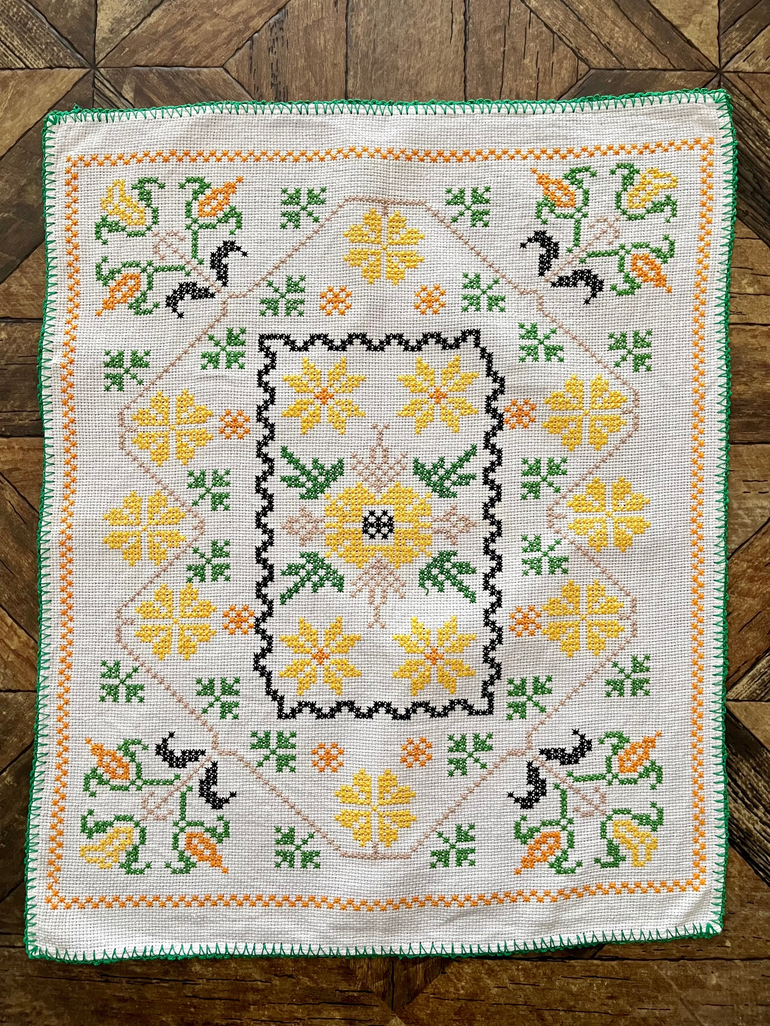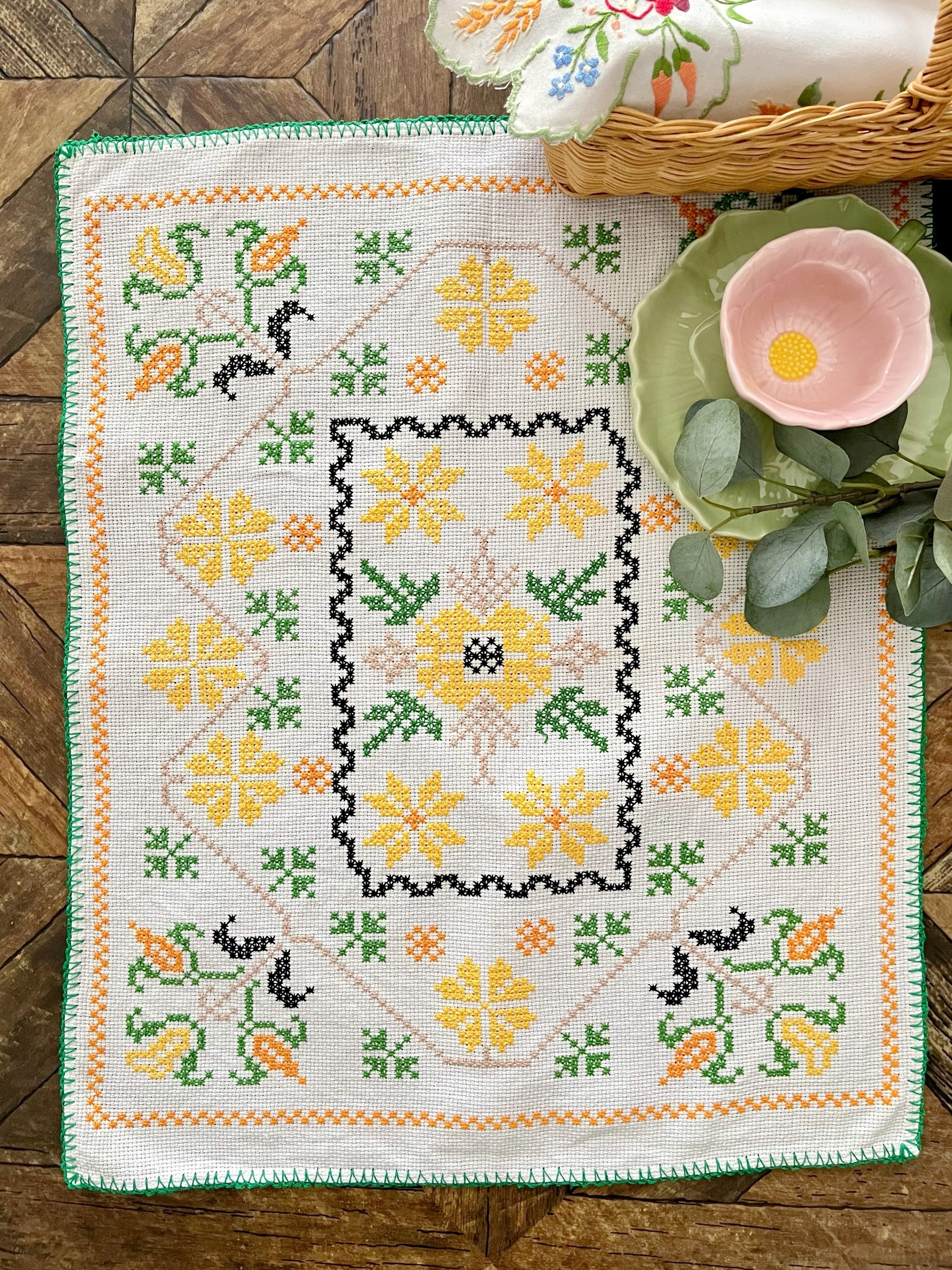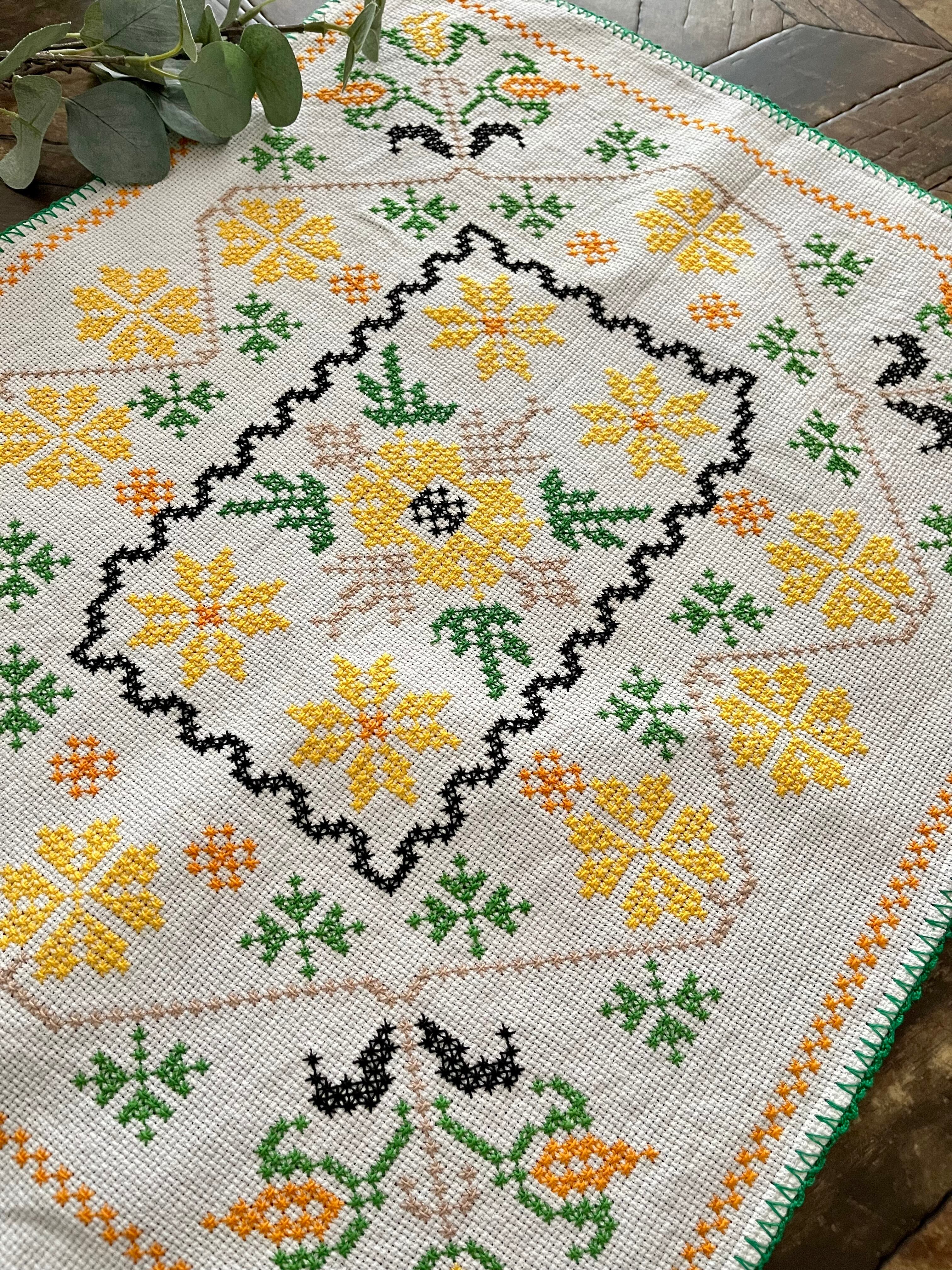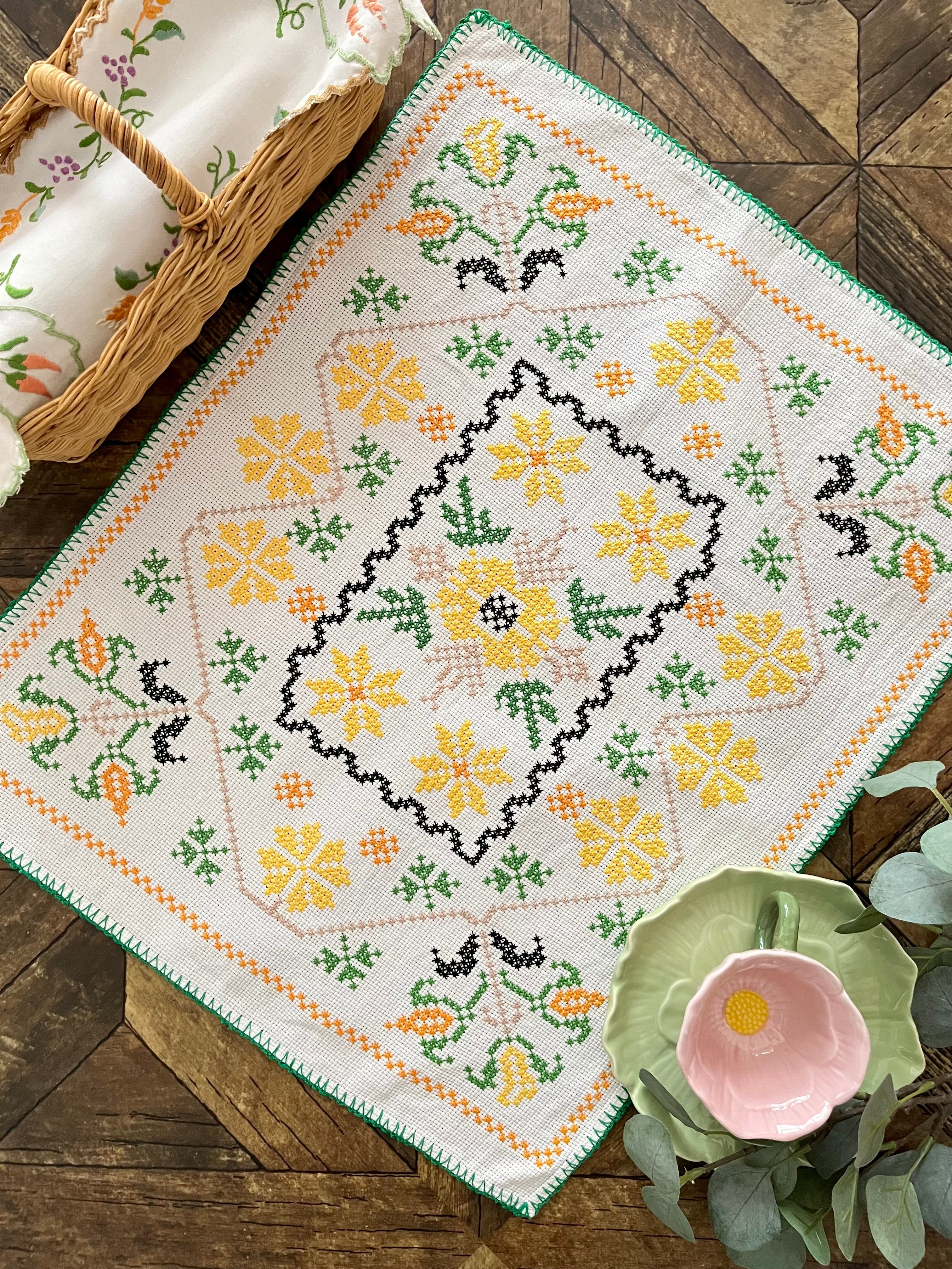 【緑縁】イエロー×グリーンのナチュラル刺繍のクロス ヴィンテージハンガリー刺繍 61×49 cm