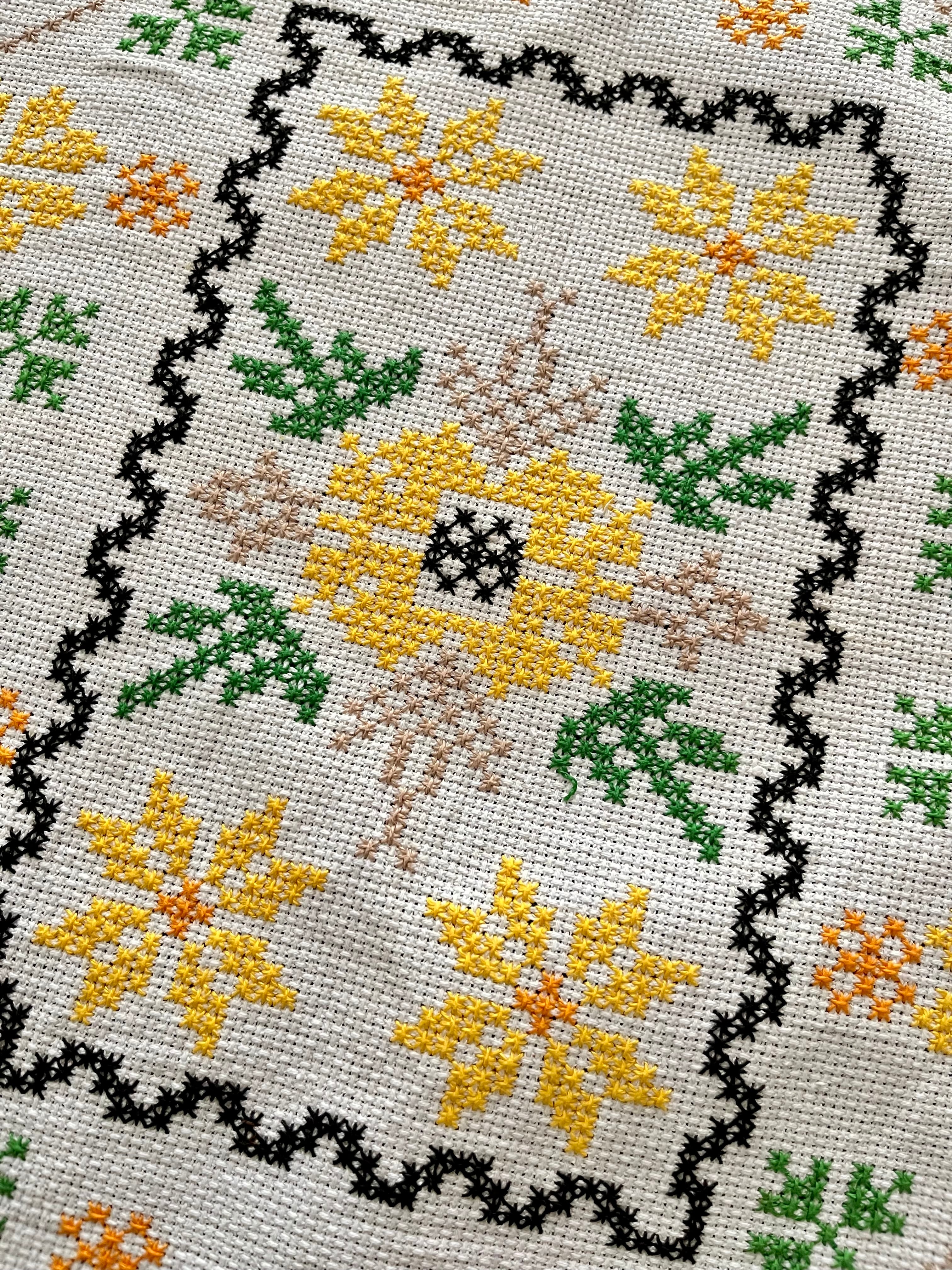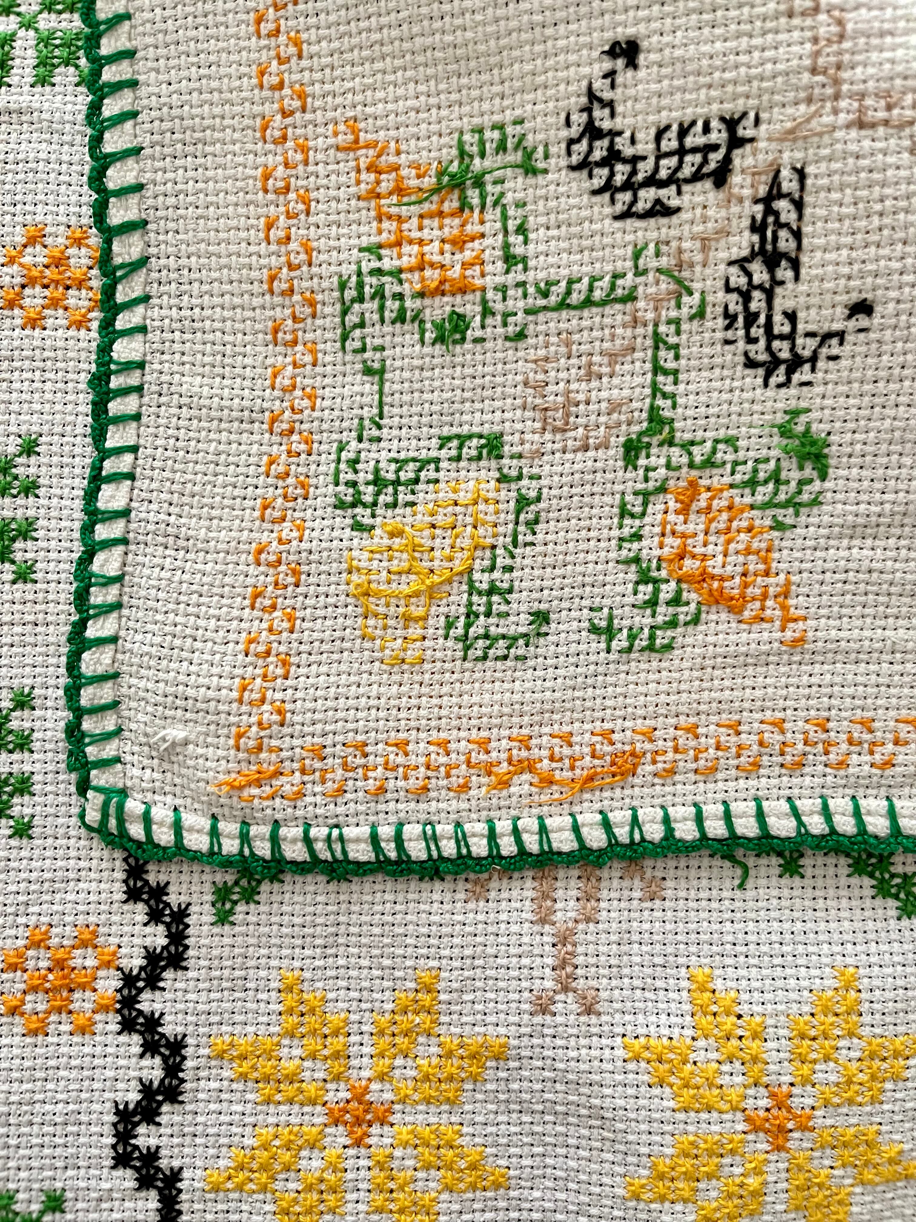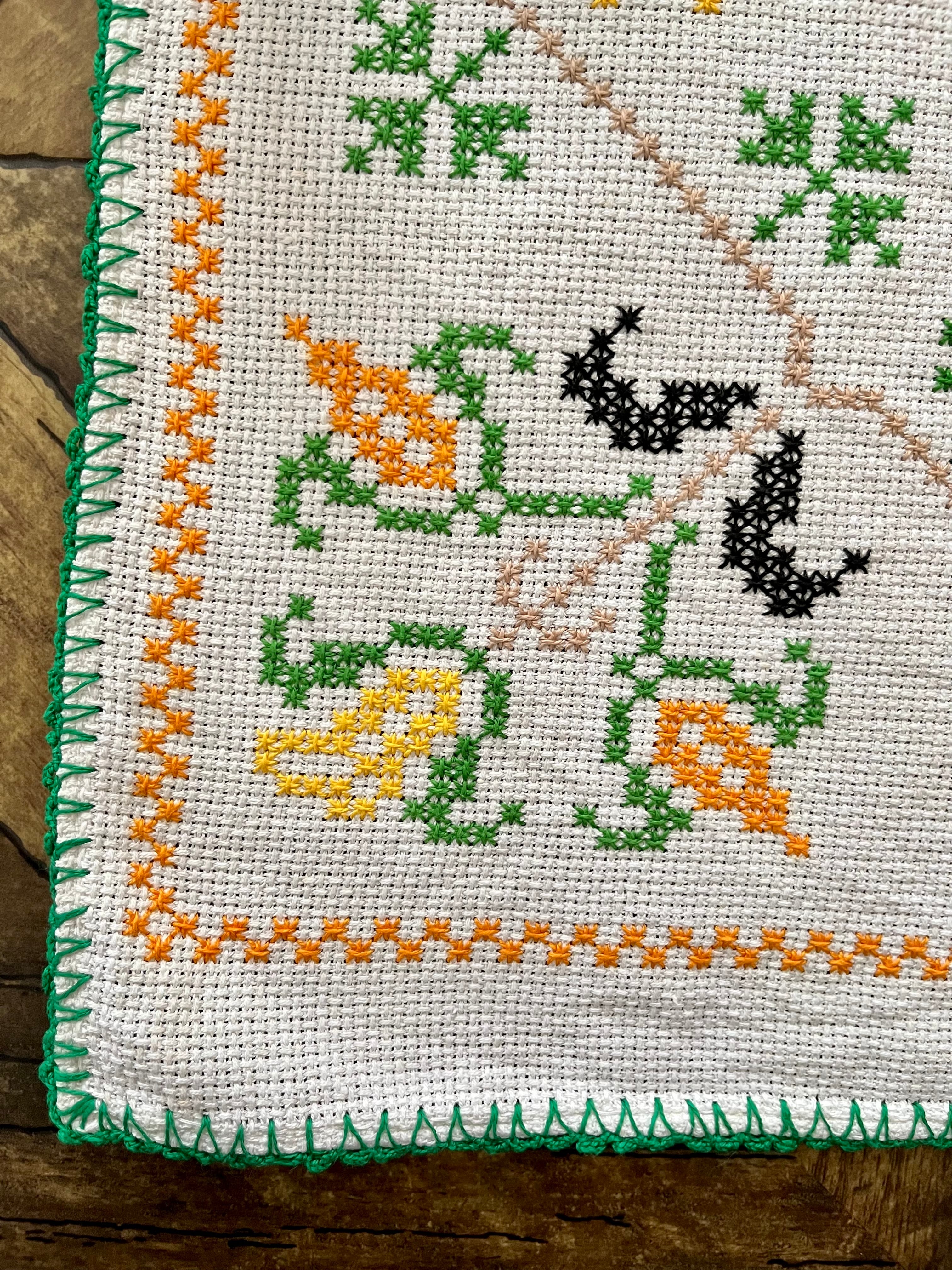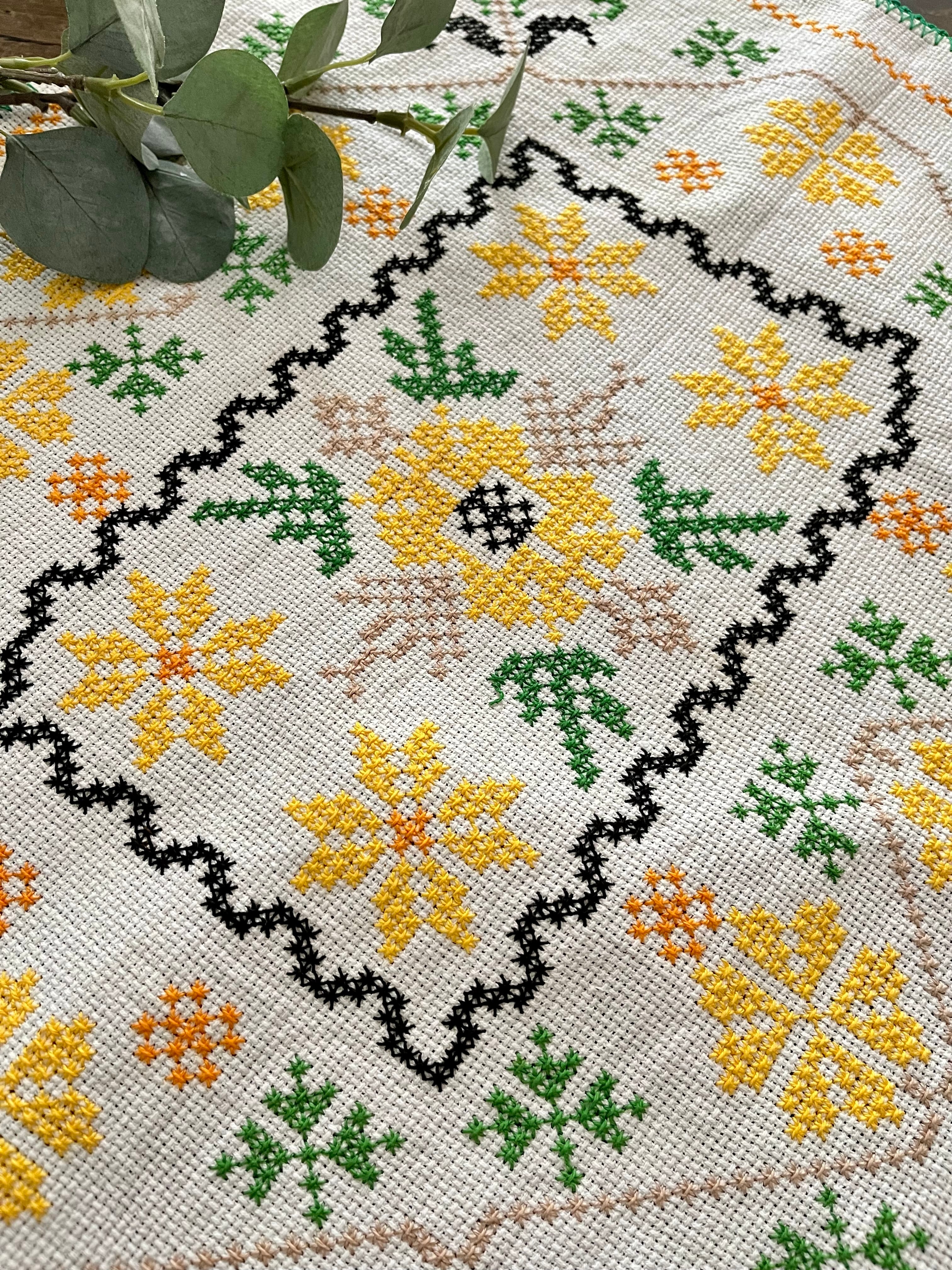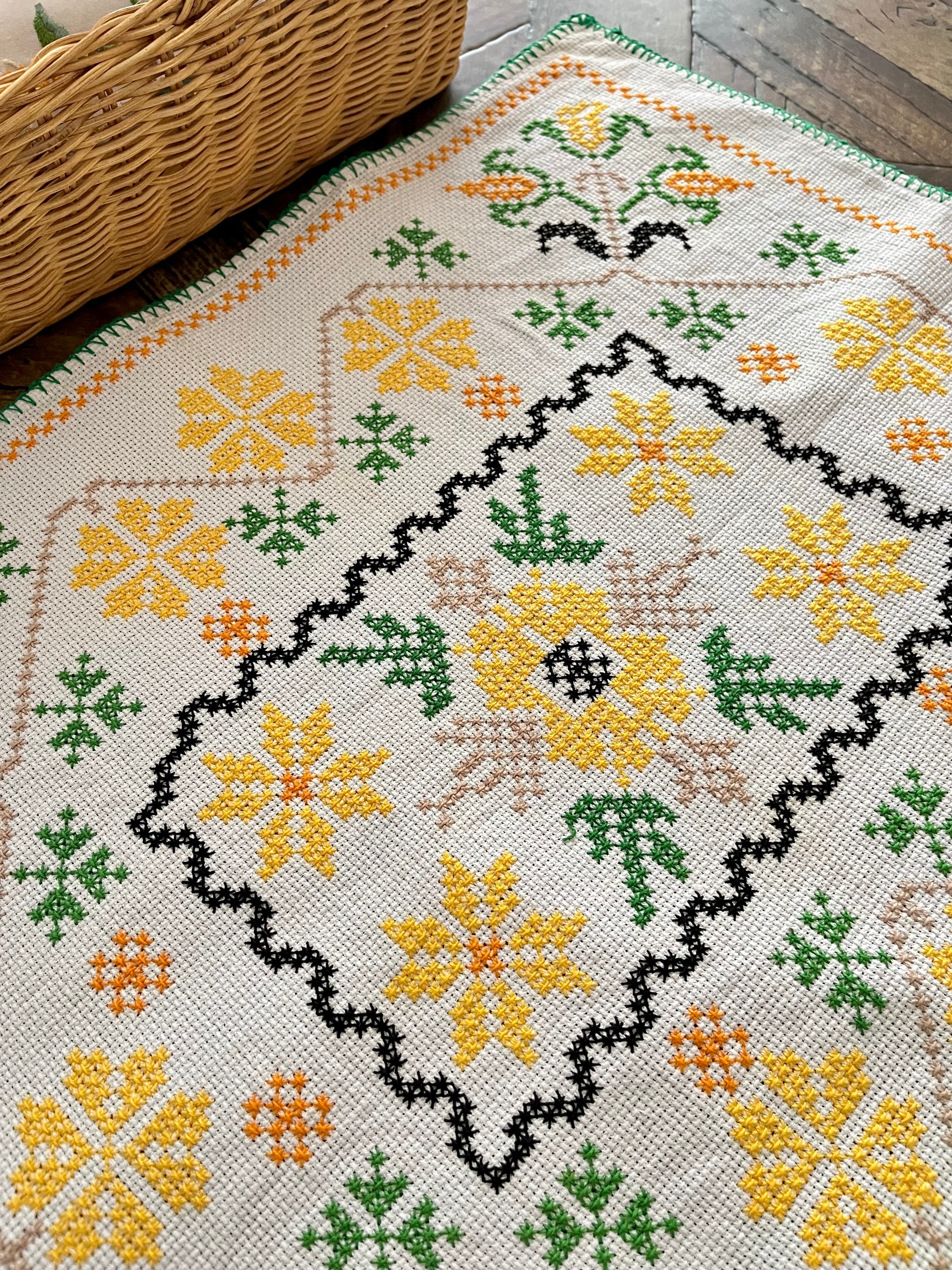 【緑縁】イエロー×グリーンのナチュラル刺繍のクロス ヴィンテージハンガリー刺繍 61×49 cm
