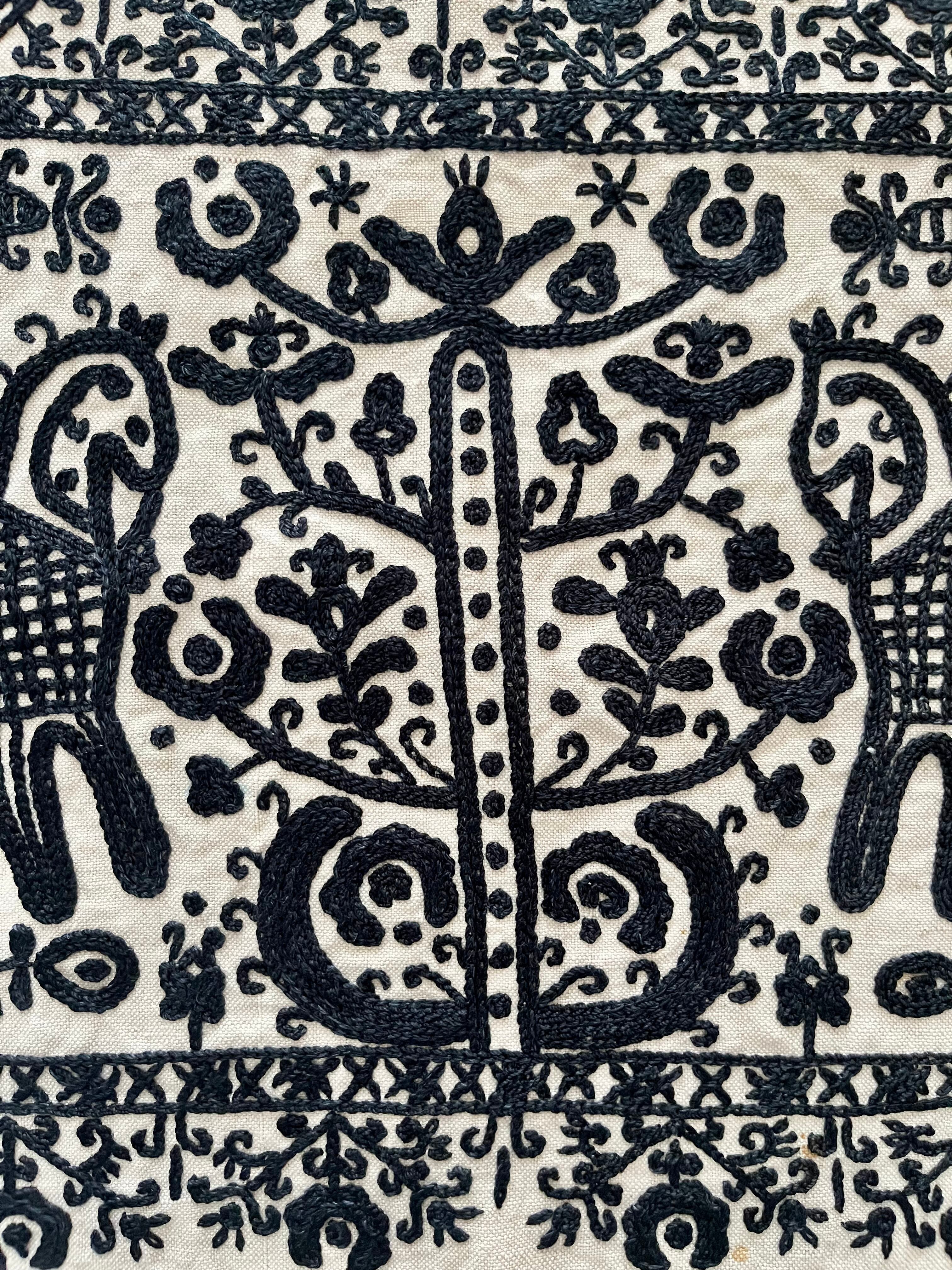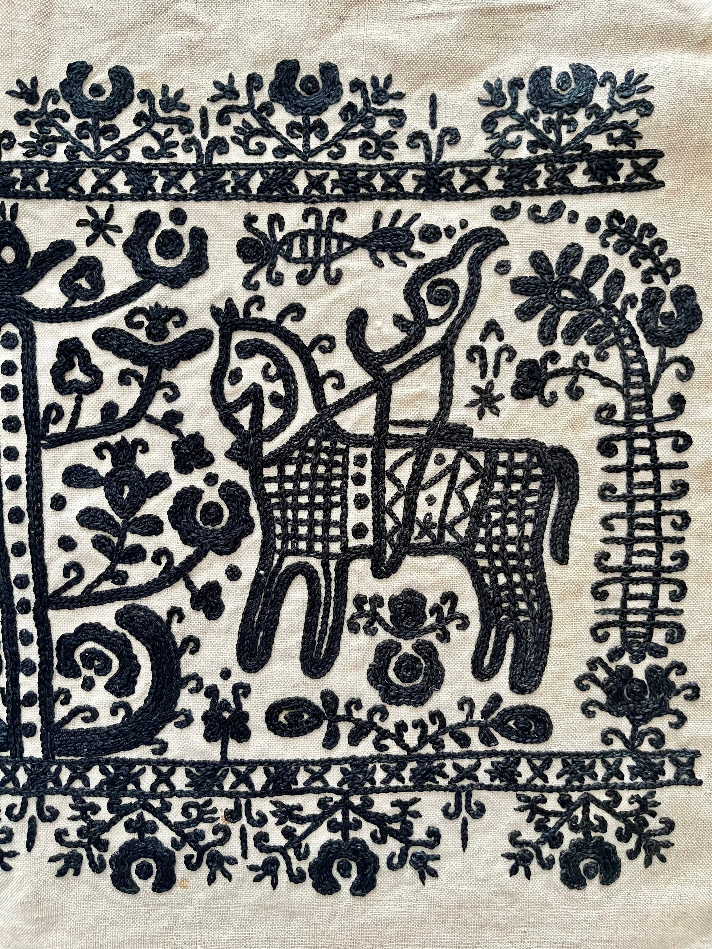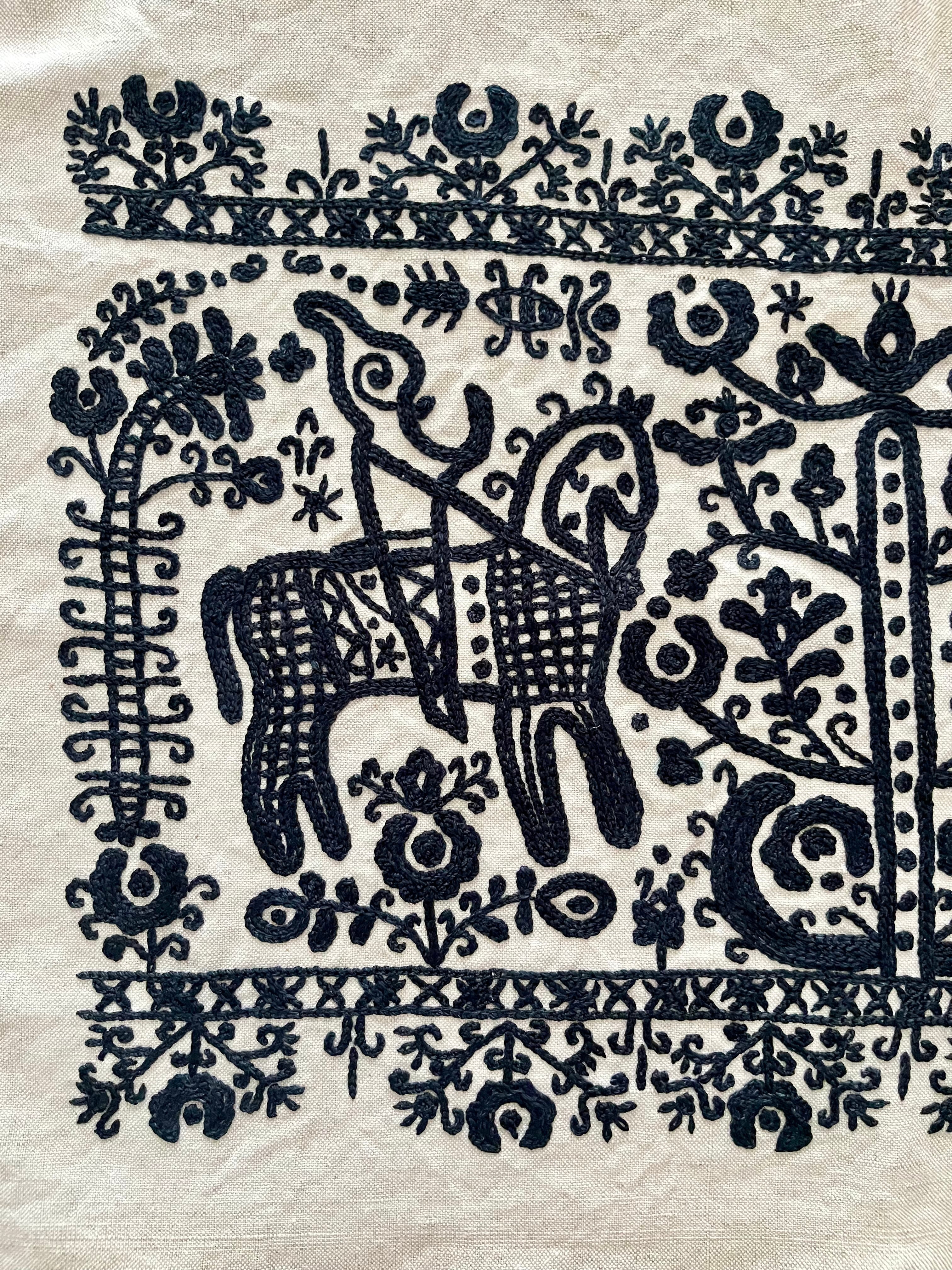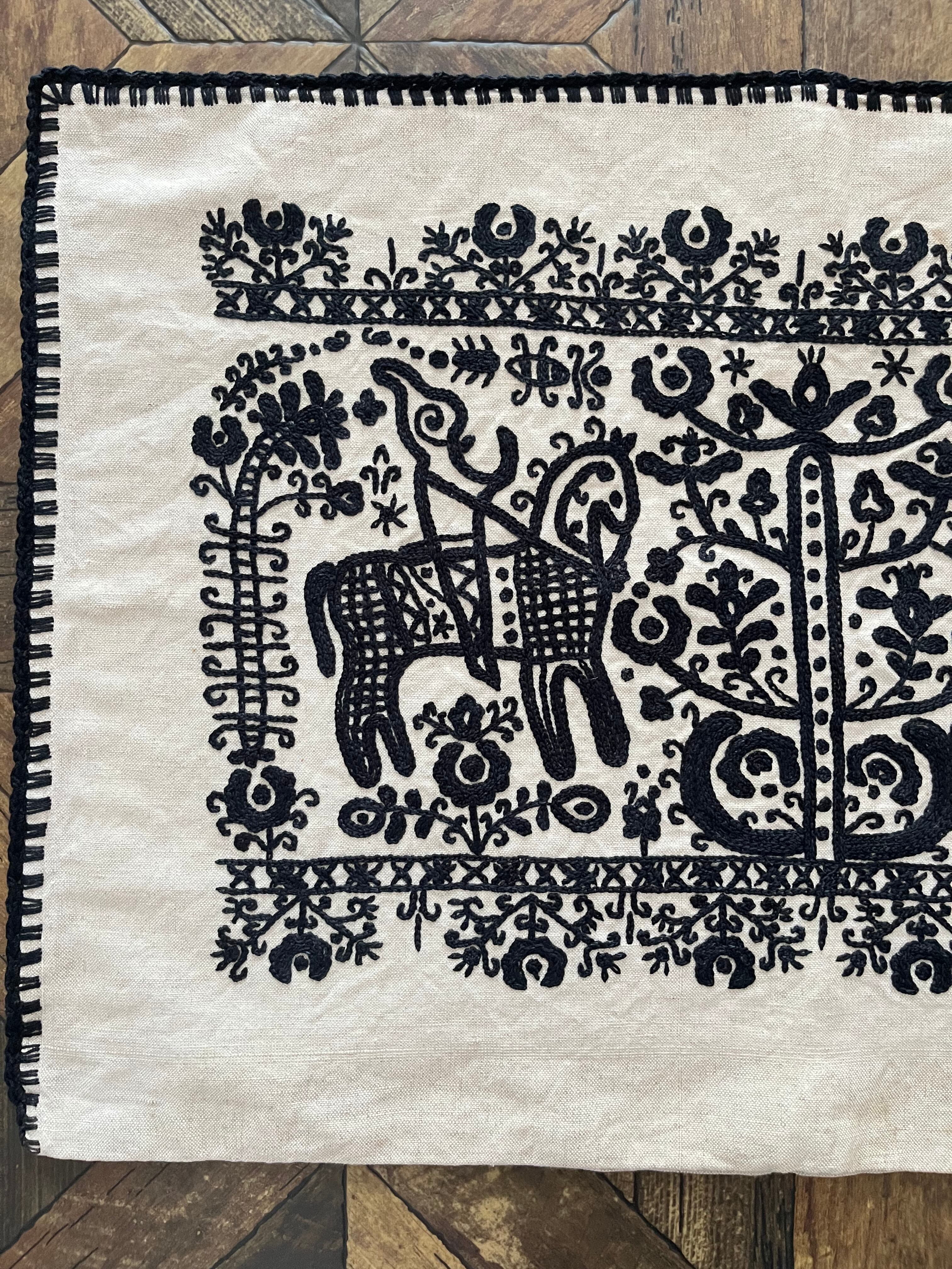 中心には生命の樹、そして2頭の馬の刺繍。手綱を引く人のようなモチーフも…