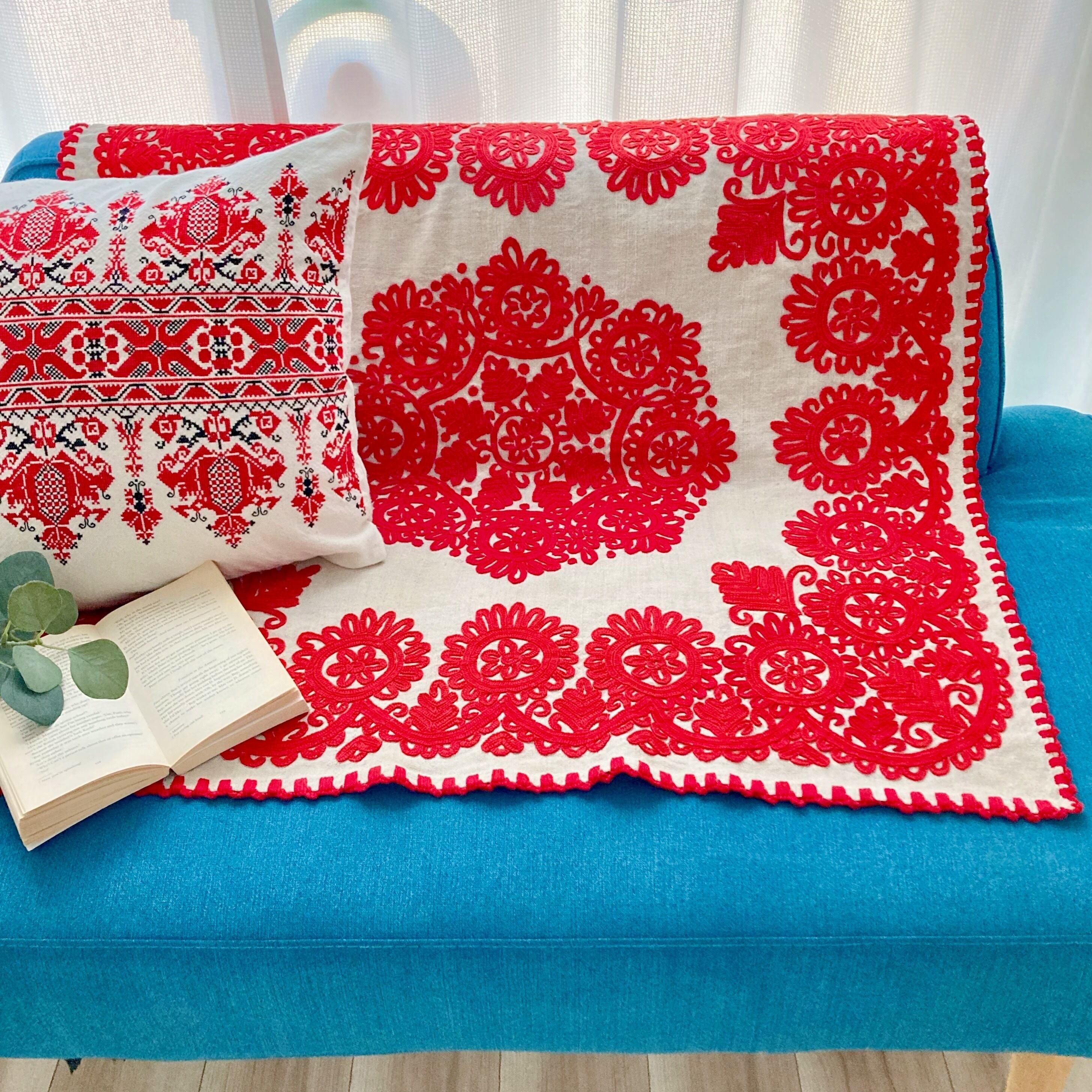 こちらは非常に丁寧かつ超豪華な刺繍が施された本当に美しい1枚。これだけ大きな布に太い糸で刺繍するのはかなりの根気が必要なのではないでしょうか。イーラーショシュは教会の装飾としても使われるため、テーブルの上やキャビネットの上に敷くのはもちろんのこと、壁などにかけてもとても素敵です。