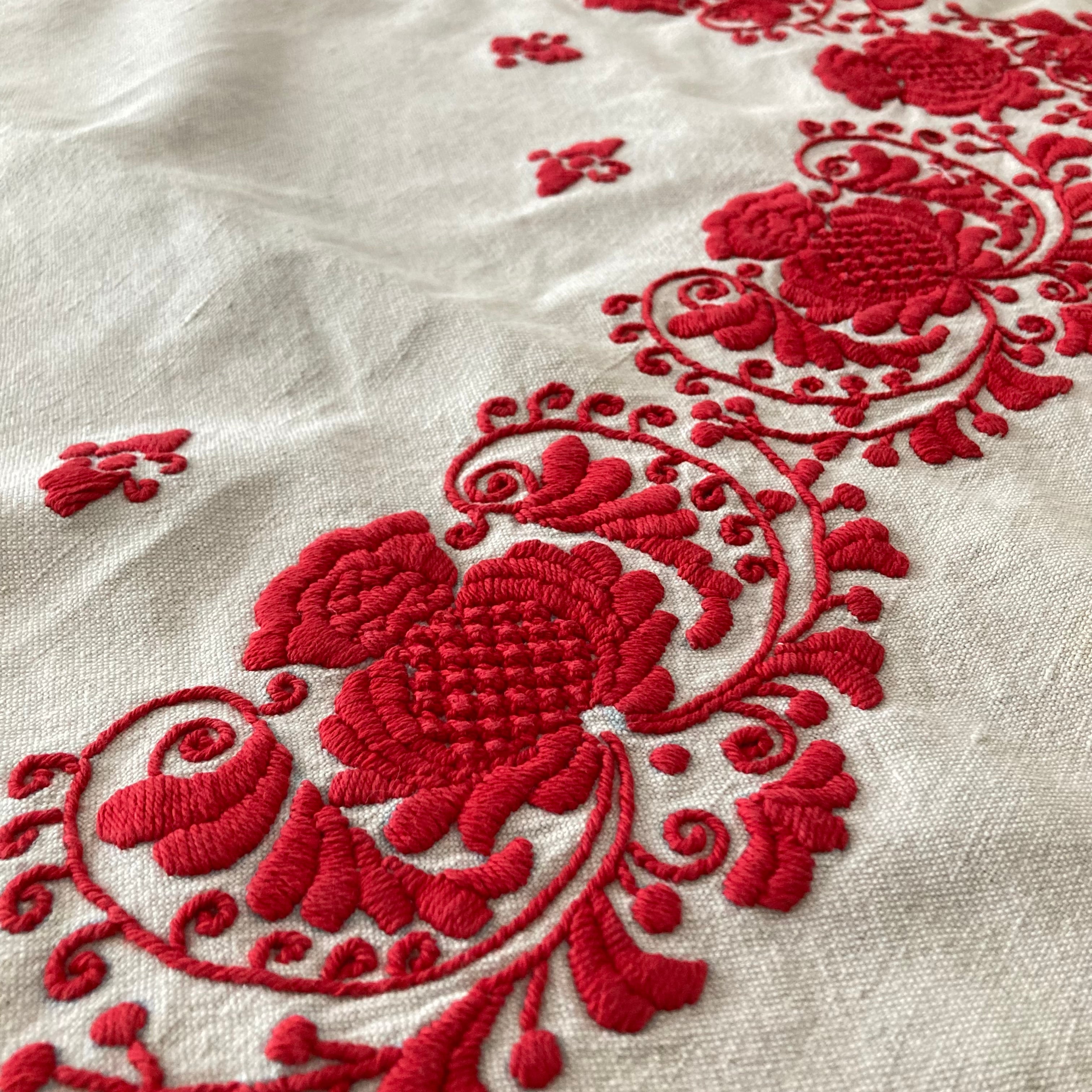 あまり見かけない刺繍ですが、ハンガリーのマダムに確認したところ、おそらくハンガリーの北西に位置する ラーバクズ地方 の刺繍とのことでした❁