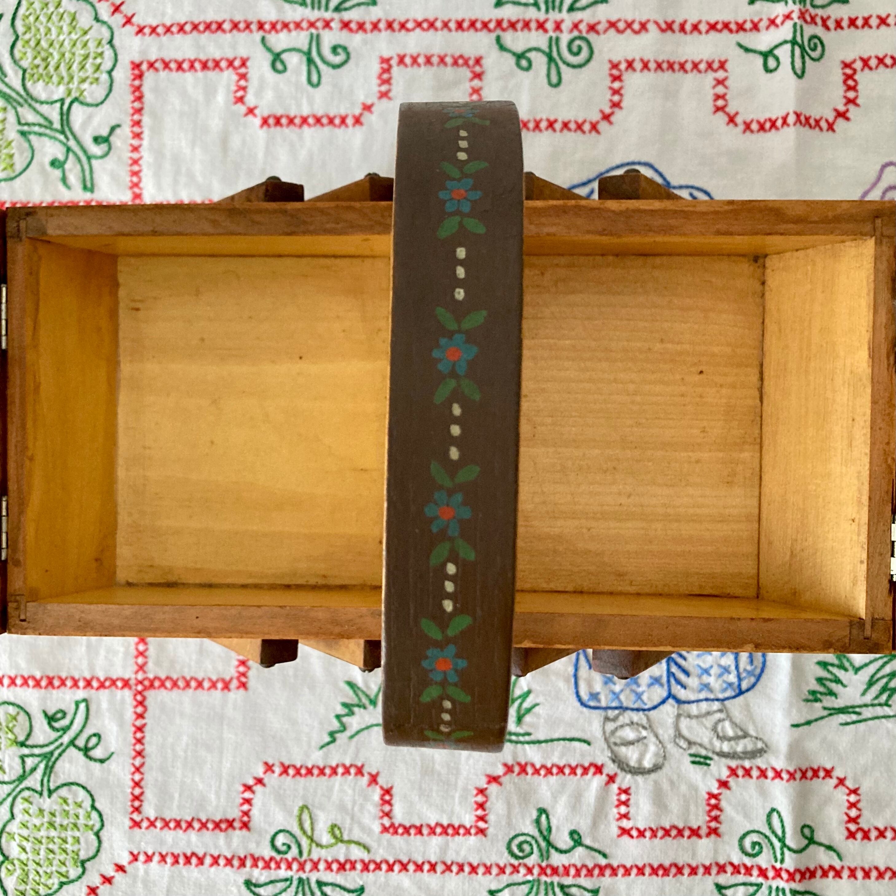 まるでチロリアンテープのような草花のペイントが目を惹くソーイングボックス。