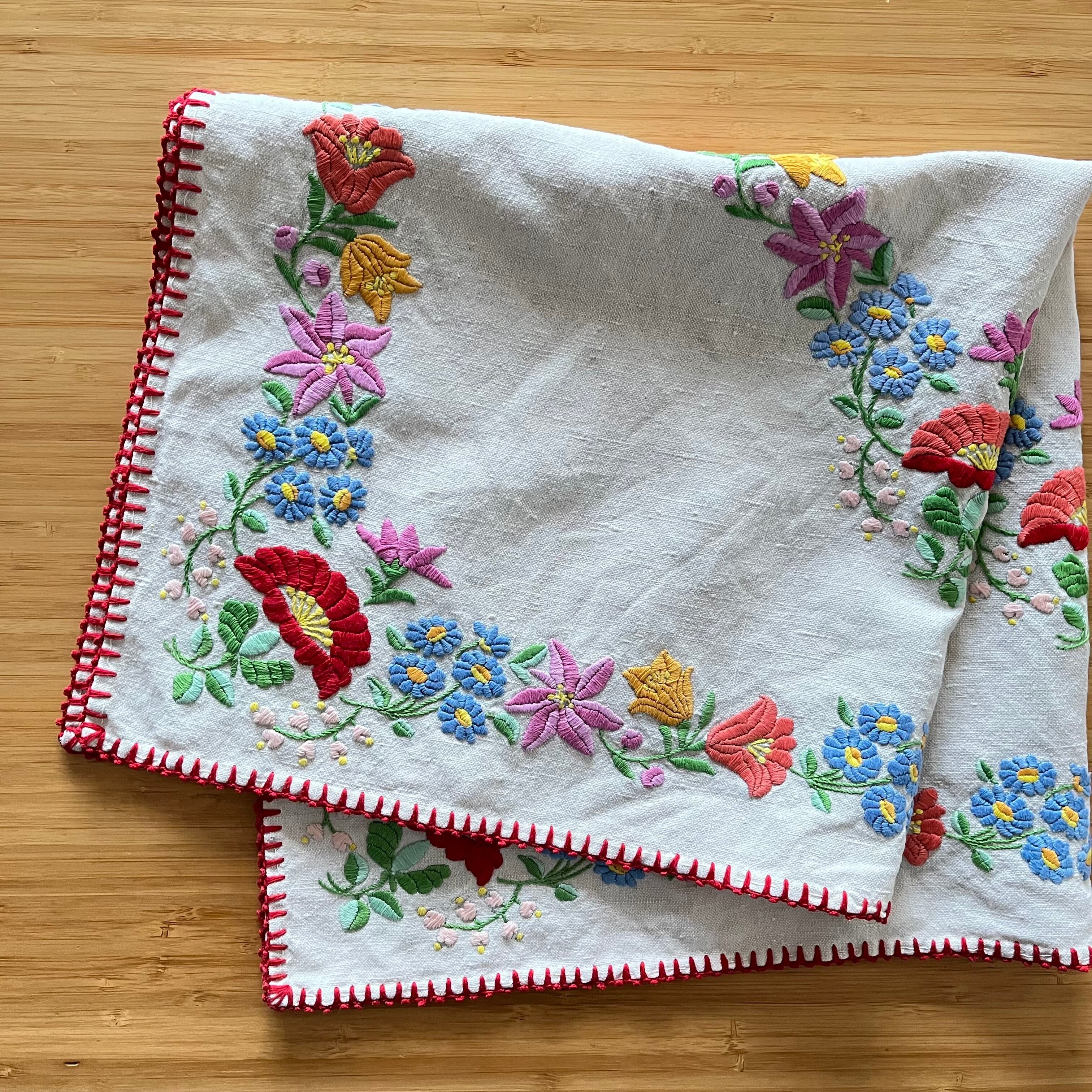 レトロかわいいキャンバス地のテーブルクロス ヴィンテージ カロチャ刺繍 71×66.5cm