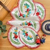 縁にたっぷりと刺繍された赤いドットと、丸っこい若草色の葉が印象的な1枚。