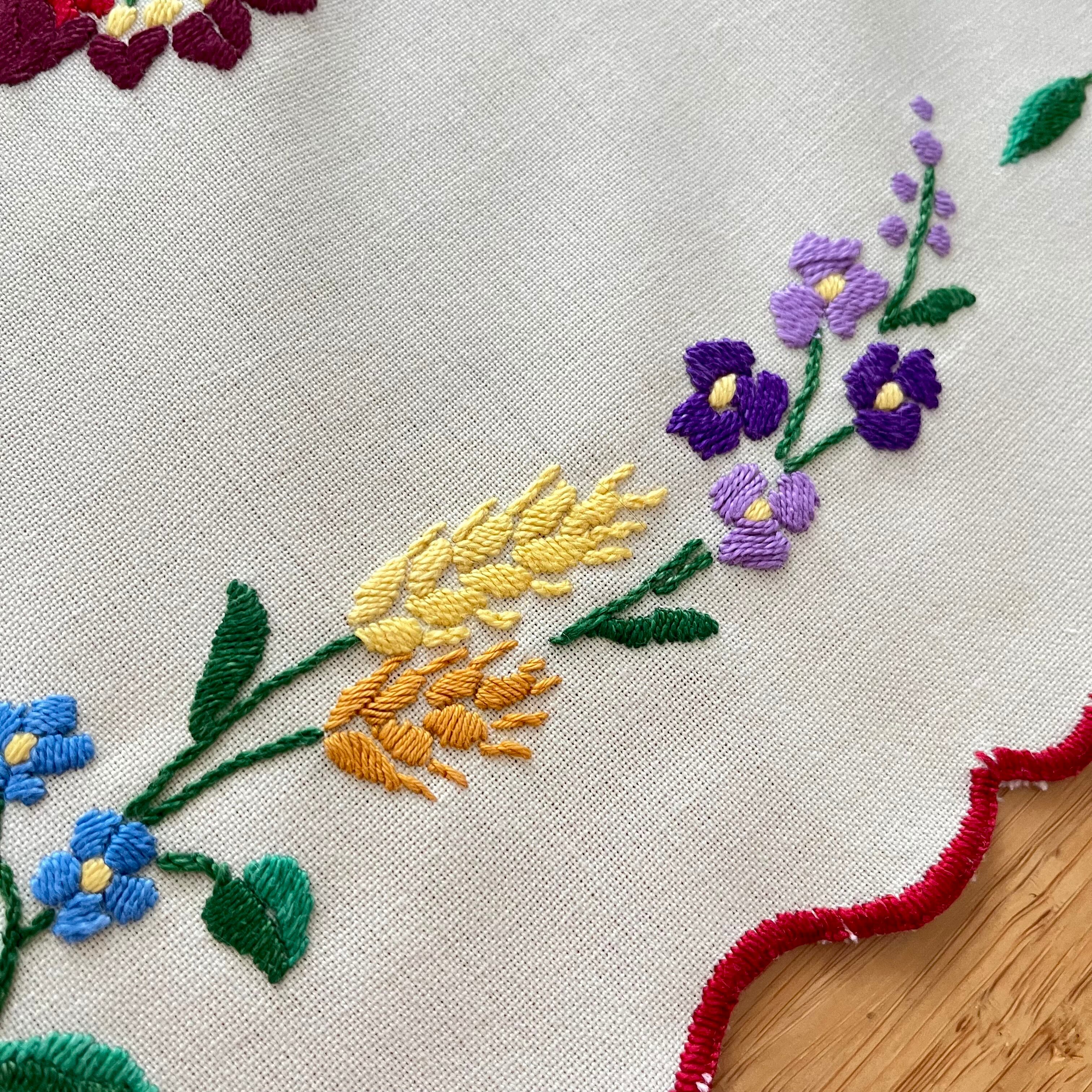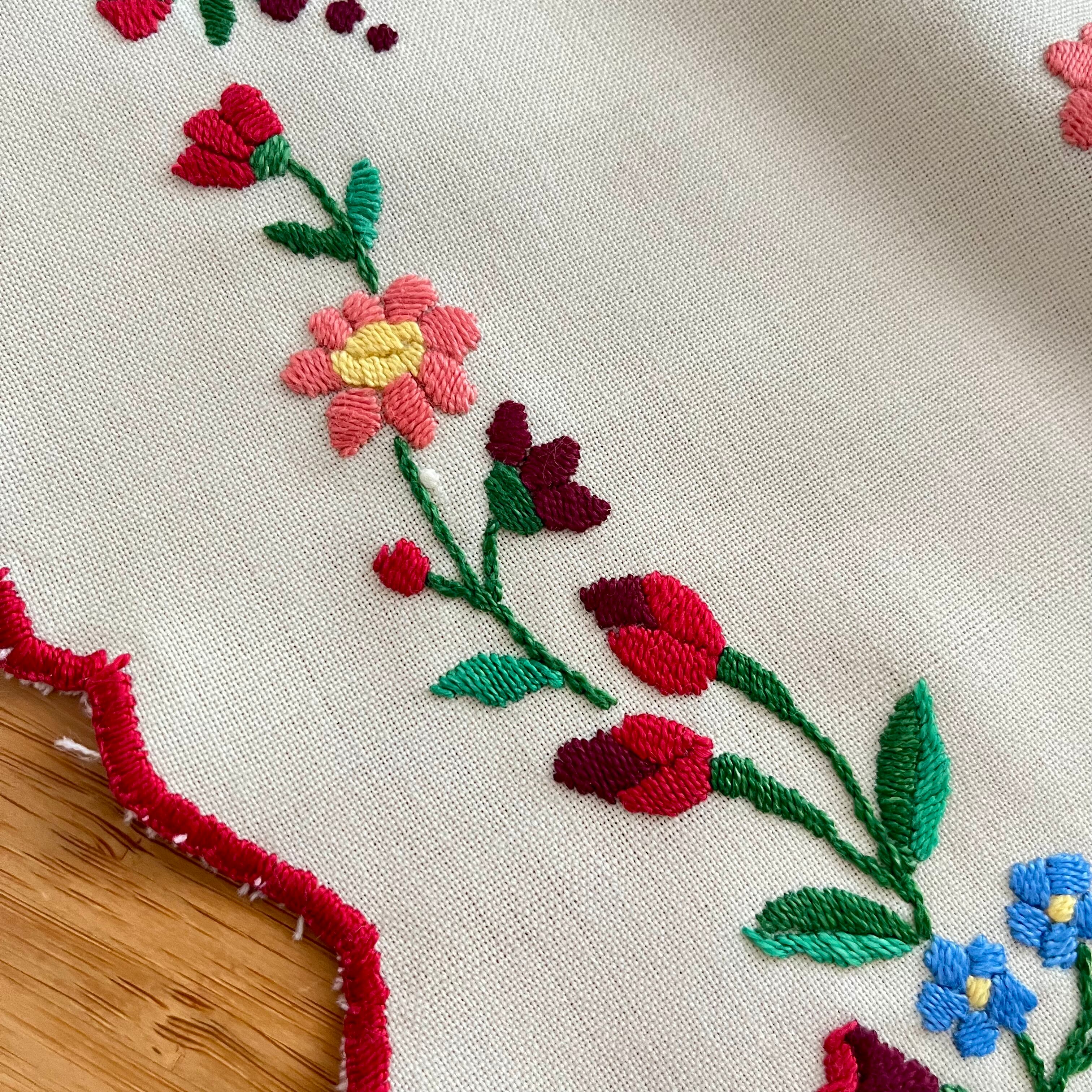 可憐なイメージがある暖色系のカロチャ刺繍ですが、深い赤がスパイスになり落ち着いた印象にもなるんですね!どこを切り取っても美しい傑作です。